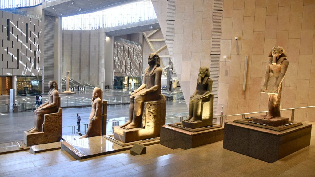 • Didžiojo Egipto muziejaus Didžioji salė gali pasigirti įspūdinga kolekcija, įskaitant milžinišką karaliaus Ramzio II statulą, Sakaros kanoną, kuriame išvardyti 58 karaliai nuo I iki XIX dinastijos, ir Merenpetacho pergalės koloną, skirtą jo senovės užkariavimams atminti. Taip pat eksponuojamos Ptolemėjų karaliaus ir karalienės statulos, iškeltos iš nuskendusio Herakliono miesto, ir 10 Senusreto I statulų, pabrėžiančių Egipto meistriškumą ir palikimą.
