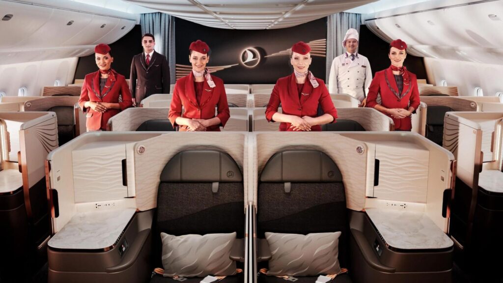 Verslo klasė: pilnai išsitiesiančios lovos, garsiojo Turkish Do&Co meniu patiekalai, premium gėrimai, privatūs darbui ir poilsiui skirti salonai, didesni ekranai, greitesnė registracija, verslo kambariai įskaičiuoti.