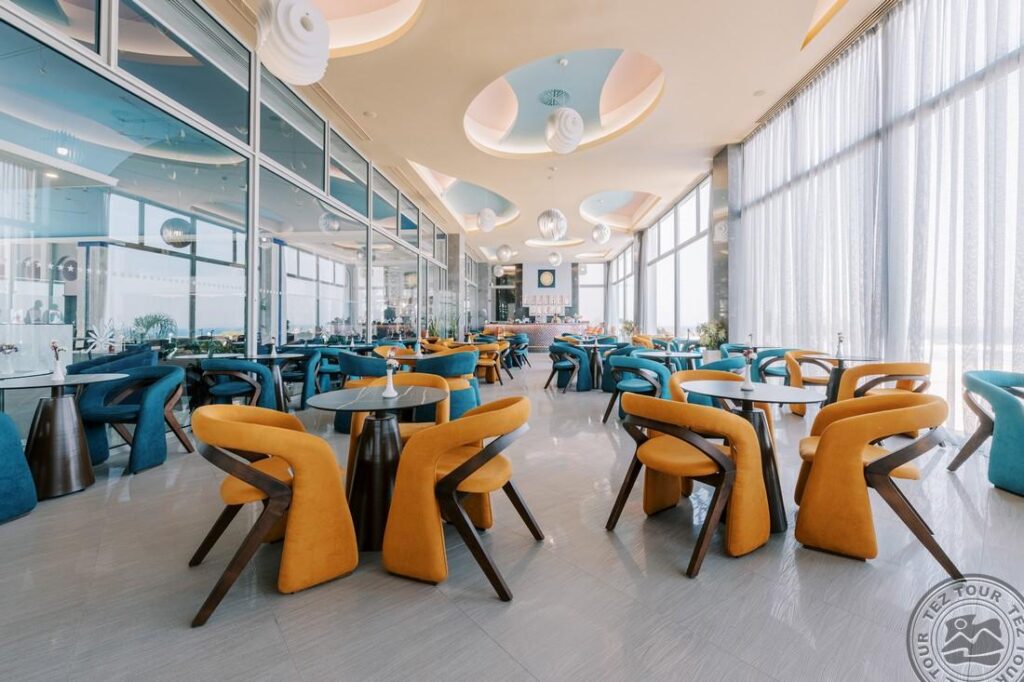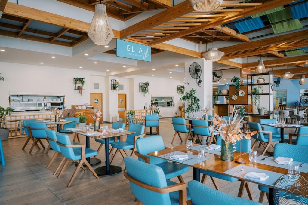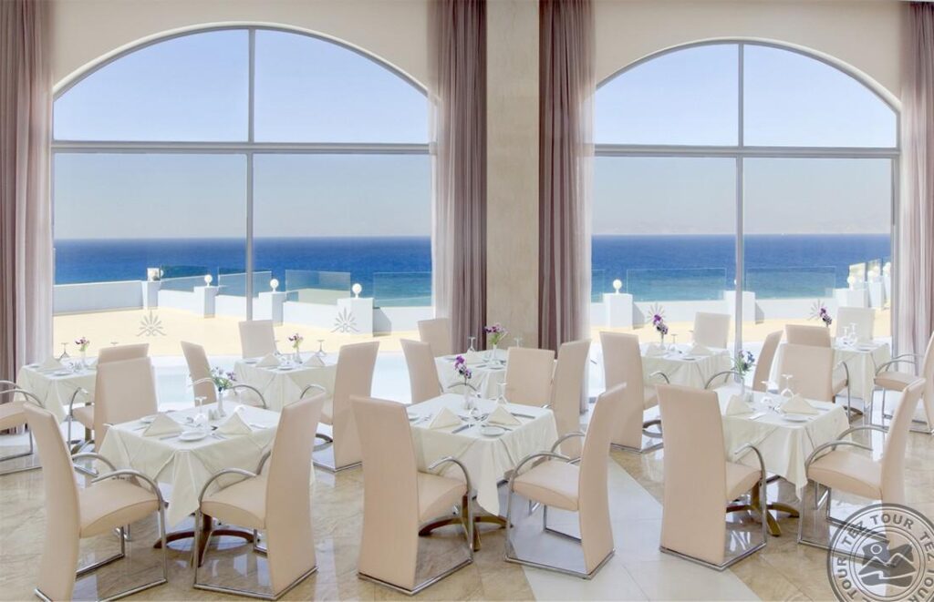 - a la carte restoranai: 4 (graikiškas ELIA ir itališkas TRAMONTO – pietūs ir vakarienė (už papildomą mokestį), azijietiškas Koi ir graikiškas Porfyra – vakarienė (už papildomą mokestį, būtina išankstinę rezervaciją, aprangos kodas vyrams – ilgos kelnės vakarienės metu))