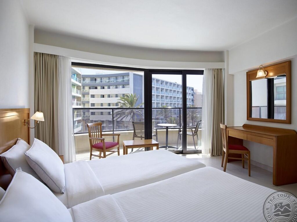 Superior Room tipo numeriai (renovuotas kambarys su vaizdu į 100 palmių aikštę, pagrindinė lova – 2 viengulės lovos, maks. 2 asmenys, apie 22 m²).