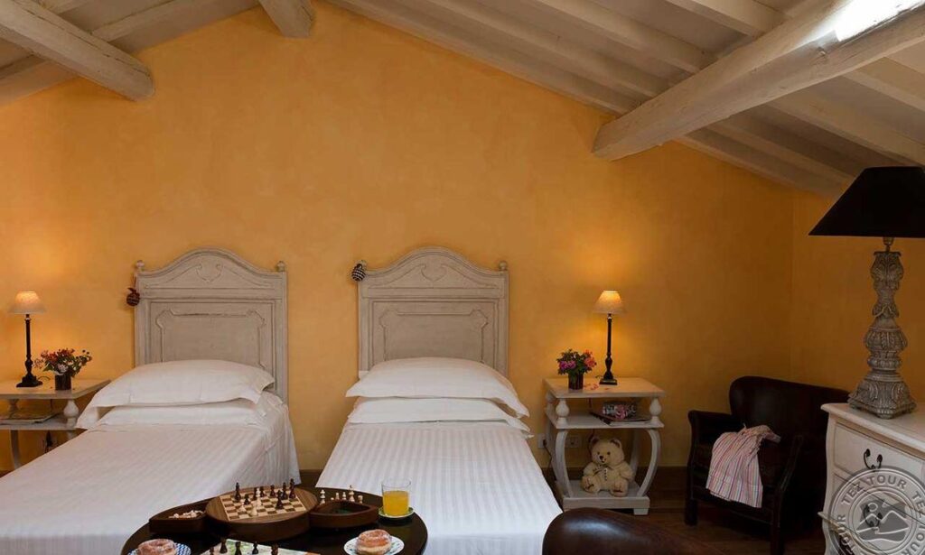 Junior Suite tipo numeriai (su panoraminiu vaizdu į aplinkines kalvas, alyvmedžių laukus ir vynuogynus, miegamasis su poilsio zona, dvigule lova, židinys, drabužinė, maks. 3 asm., 55 m2);