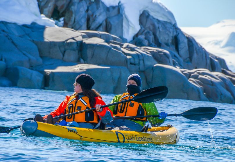 Ypatinga patirtis: Keliautojai gali plaukioti kajakais tarp ledkalnių ir stebėti pingvinų, ruonių ir banginių gyvenimą ledynų apsuptyje.