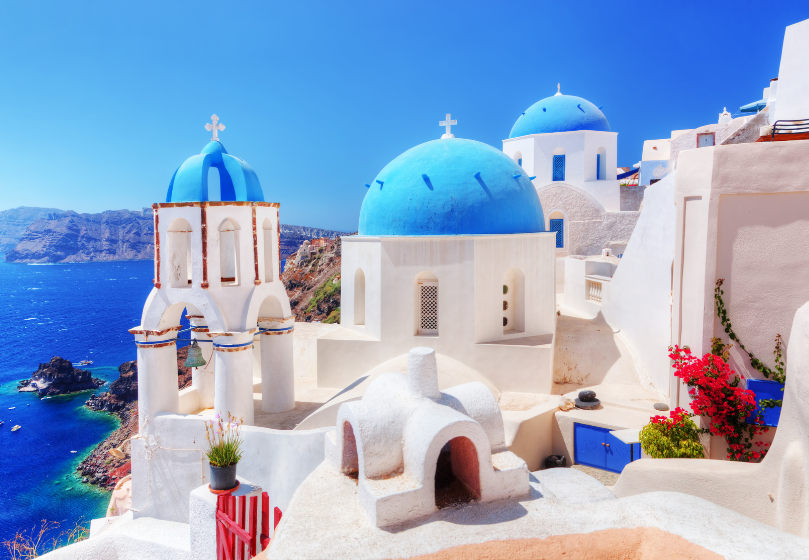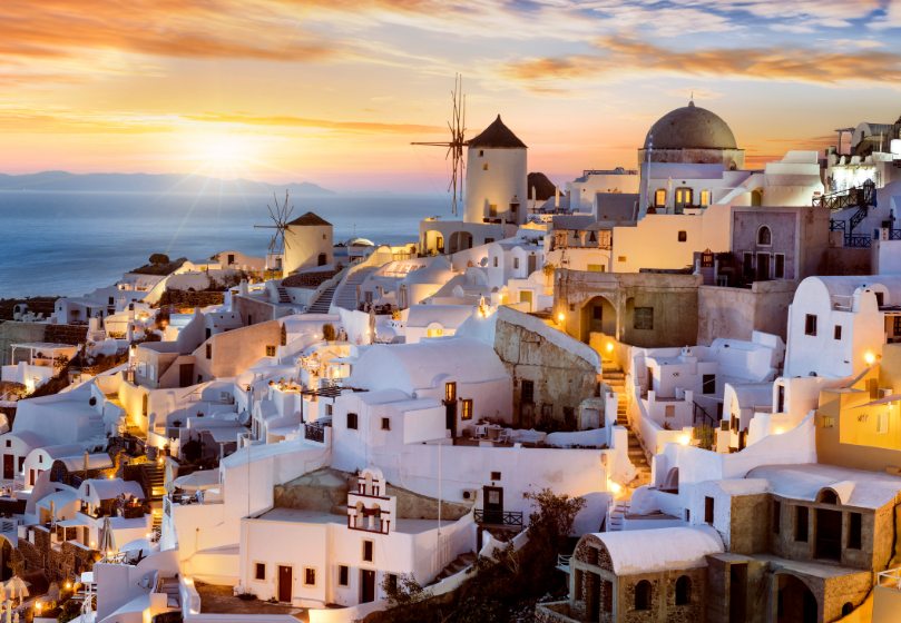 Ypatinga patirtis: Suraskite geriausią vietą saulėlydžiui stebėti, pasivaikščiokite siauromis gatvelėmis ir nusifotografuokite prie ikoninių trijų mėlynų kupolų.